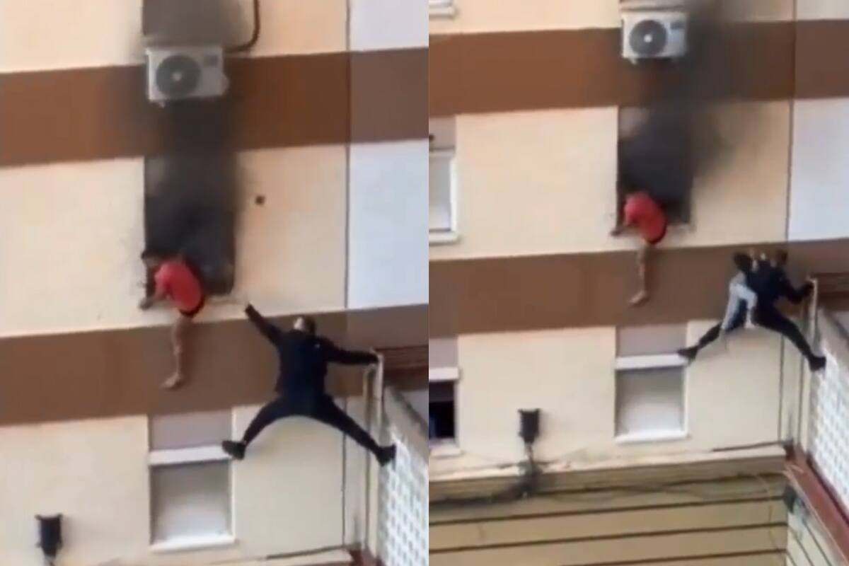 El hombre trepó por la fachada de su vivienda para llegar a la ventana donde se encontraba la familia. Apoyado en sus piernas en el borde, el héroe logra sacar, con un solo brazo, a un niño por la ventana y ponerlo a salvo.