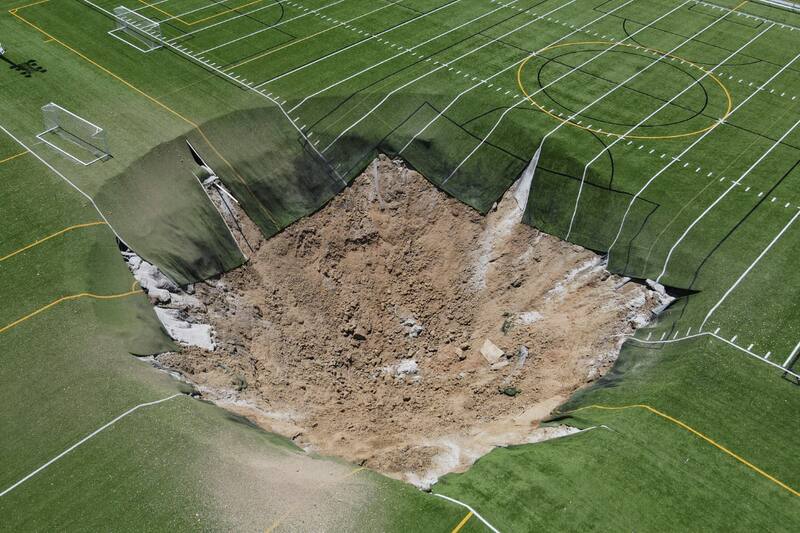 El momento exacto en el que se creó un enorme hoyo en medio de un campo de fútbol en Alton, estado de Illinois, Estados Unidos, fue capturado por cámaras de seguridad del parque Gordon Moore Park.