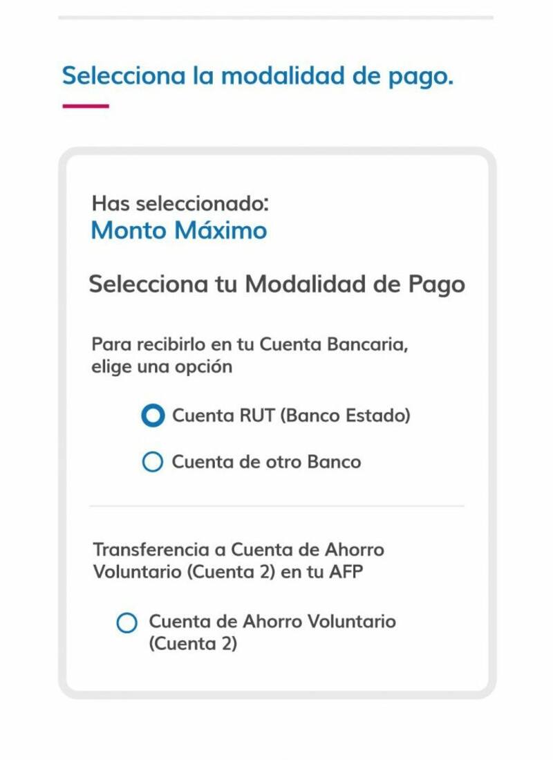 Una vez completado el formulario, se te consultará el monto que deseas retirar: Máximo, mínimo, representadas con respuestas Sí o No, o algún otro porcentaje que el o la cotizante estime.