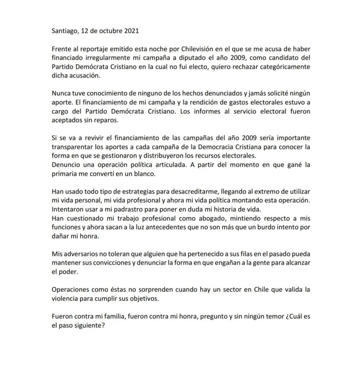 "Quiero rechazar categóricamente esa acusación", señaló Sichel. "Nunca tuve conocimiento de ninguno de los hechos denunciados y jamás solicité ningún aporte. El financiamiento de mi campaña y la rendición de gastos electorales estuvo a cargo de la DC. Los informes al Servel fueron aceptados sin reparo".