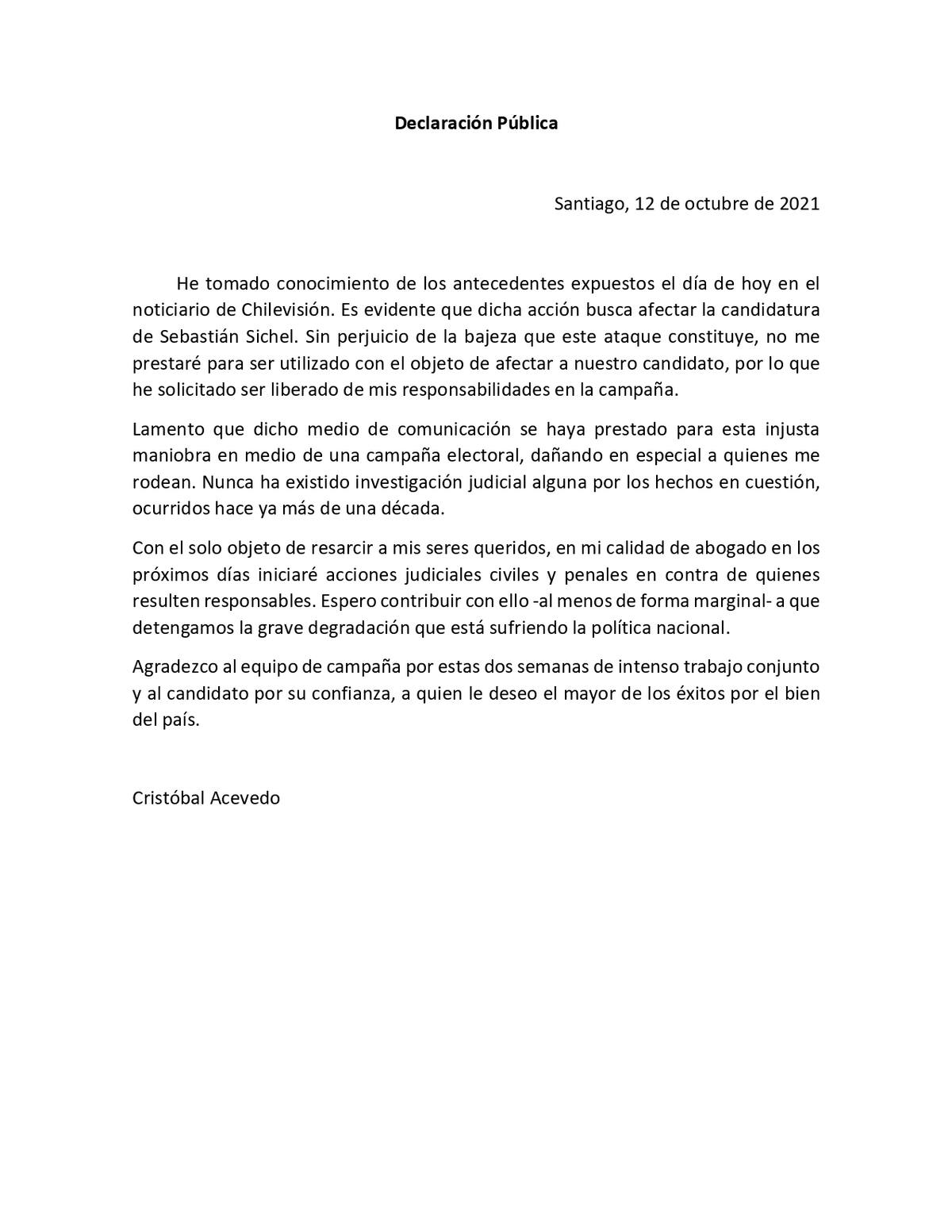 "Es evidente que dicha acción busca afectar la candidatura de Sebastián Sichel. Sin perjuicio de la bajeza que este ataque constituye, no me prestaré para ser utilizado con el objeto de afectar a nuestro candidato, por lo que he solicitado ser liberado de mis responsabilidades en la campaña", añadió en la declaración pública.