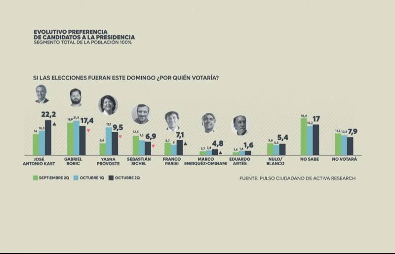 Una de las bajas más notorias sufrió el abanderado oficialista Sebastián Sichel (Chile Podemos Más), situado en el quinto lugar de las preferencias con un 6,9%.