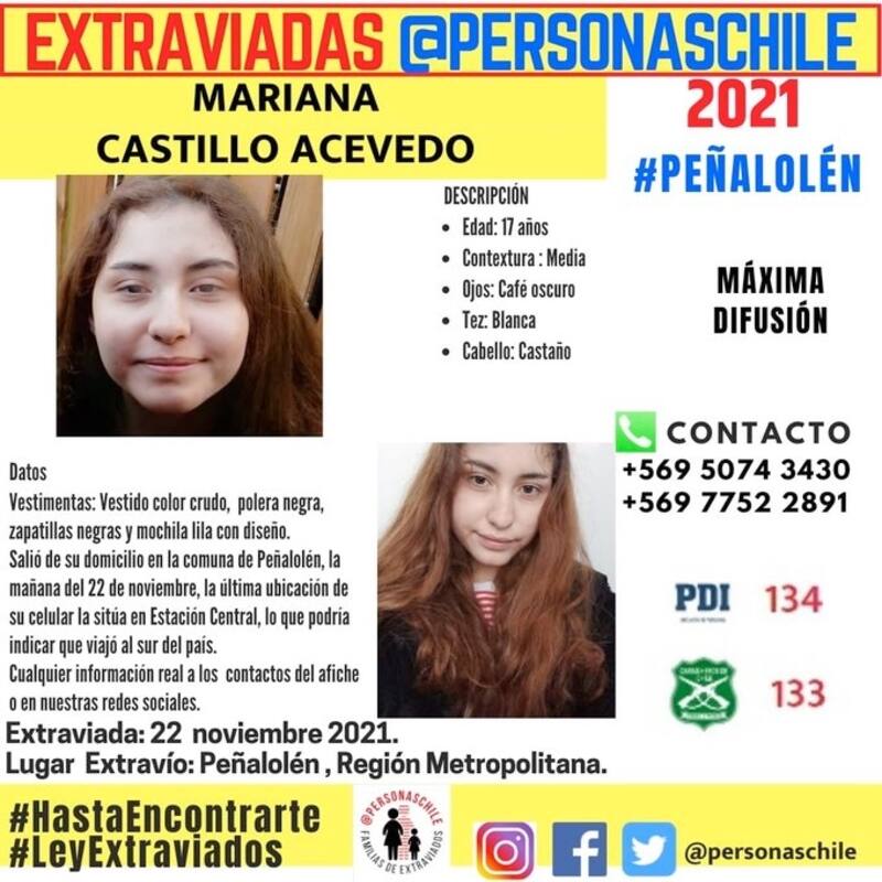 Una intensa búsqueda está llevando a cabo la familia de Mariana Castillo Acevedo, luego de que la adolescente de 17 años se extraviara el pasado 22 de noviembre en Peñalolén, Región Metropolitana, cuando se dirigía hacia su colegio.