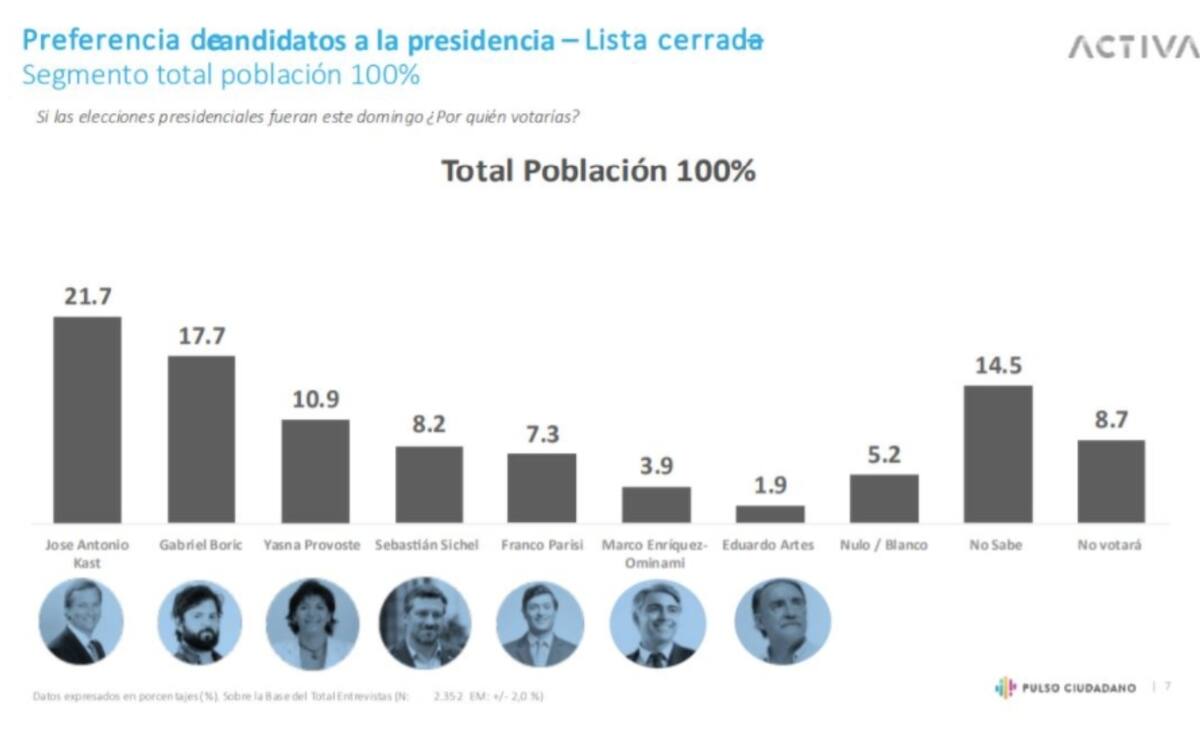 Con cuatro puntos de distancia sobre su principal oponente, el postulante a La Moneda del Frente Social Cristiano, José Antonio Kast, se situó en el primer lugar de la encuesta Pulso Ciudadano que le dio el 21,7% de las preferencias presidenciales.
