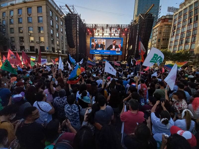 Miles de personas se congregaron en la noche del domingo en la intersección de Alameda con Santa Rosa, centro neurálgico de las celebraciones por el triunfo de Gabriel Boric en el balotaje de la elección presidencial.