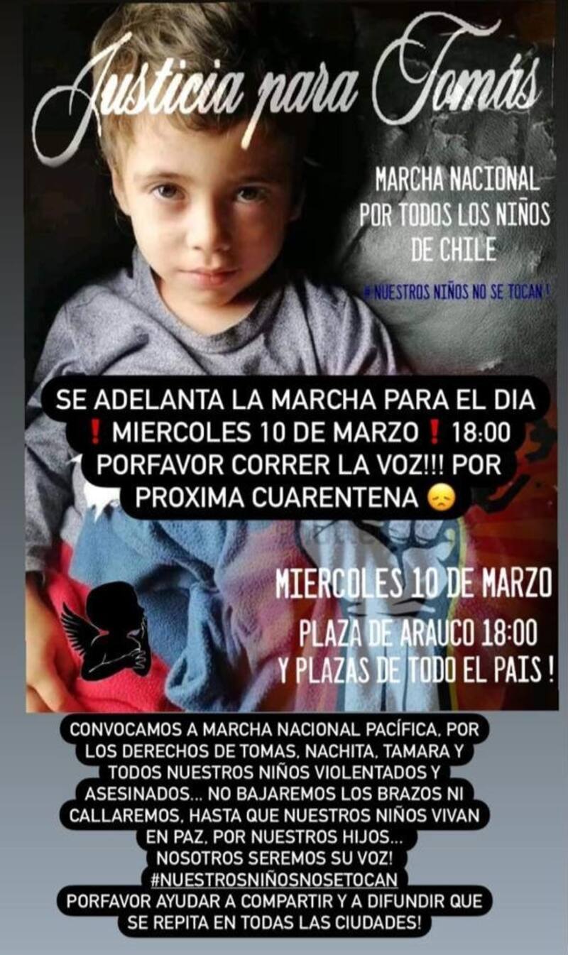 Para las 18:00 de este miércoles, la familia de Tomás Bravo, desaparecido y encontrado muerto el pasado 26 de febrero, convocó a un marcha nacional bajo la consigna "nuestros niños no se tocan", de acuerdo a lo que comunicó la madre del menor, Estefanía Gutiérrez.