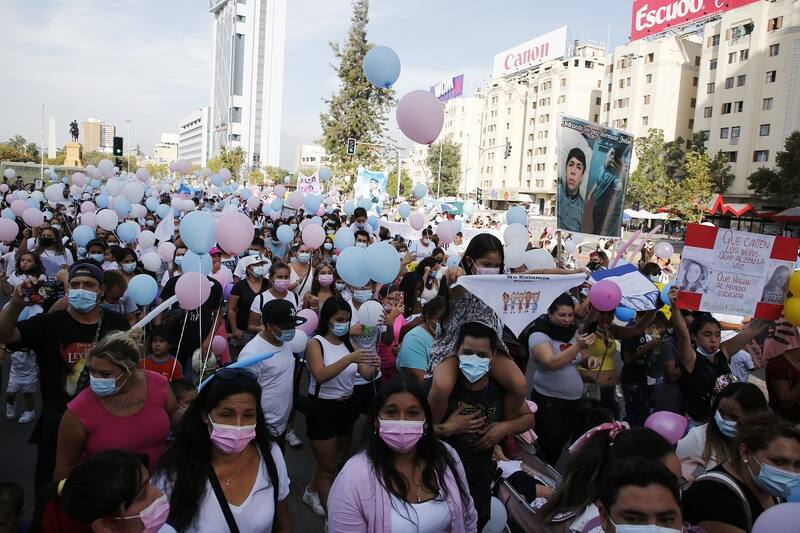 Cientas de personas se congregaron en Plaza Italia en horas de esta jornada, para desplazarse por la Alameda hacia el Palacio La Moneda. Con poleras blancas, globos del mismo color, además de celestes y rosados, y pancartas, los asistentes protestaron y reclamaron por justicia hacia las víctimas.