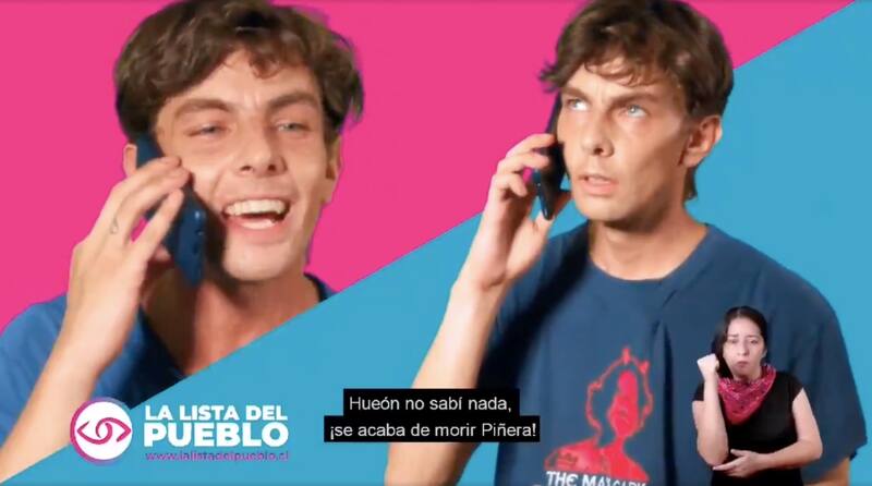 "No sabís nada hue…., se acaba de morir Piñera", señala, contestando a su vez: "Ah!, ¿pero quién lo mató?". Contesta: "nadie, se enteró de que ganaron los candidatos de la Lista del Pueblo como constituyentes y le dio un infarto al con…" y luego se lee una leyenda "Esto puede ser una realidad si votas por los candidatos de la Lista del Pueblo".