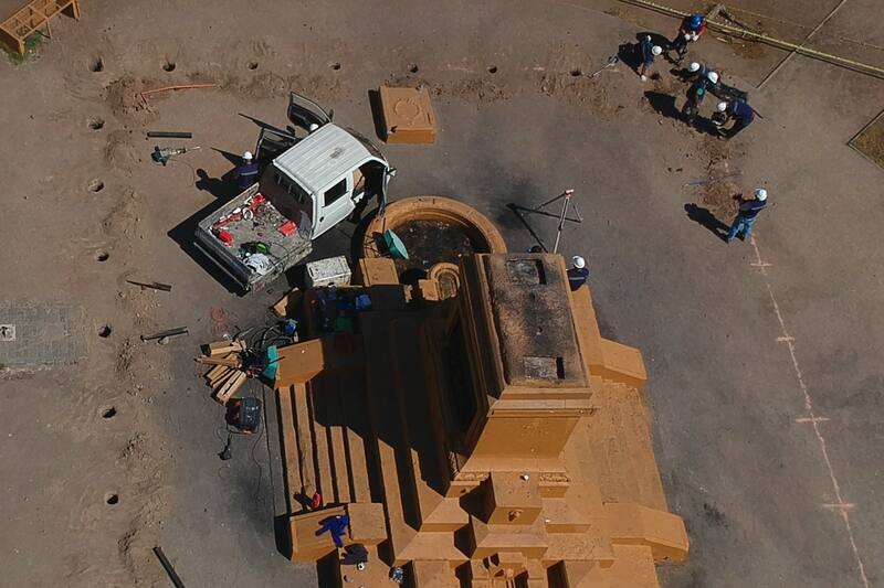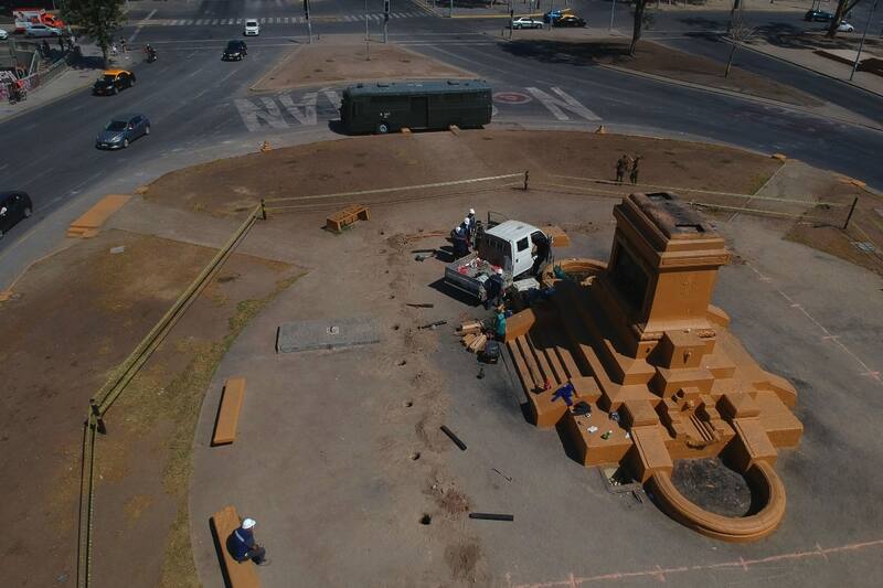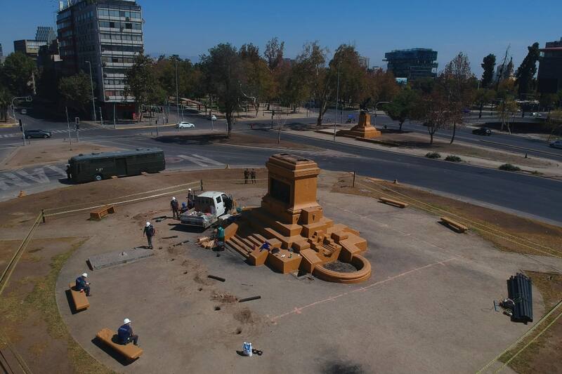 Cerca del mediodía un grupo de trabajadores provistos de maquinaria pesada y una serie de materiales, procedieron a delimitar el perímetro en el que se instalará un cerco cuyo propósito es proteger la base del monumento al general Manuel Baquedano.