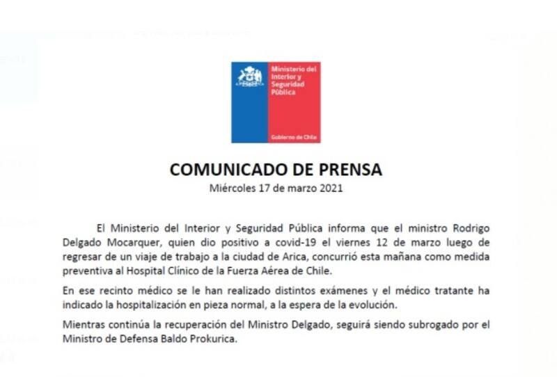El Ministerio del Interior y Seguridad Pública informó que el secretario de dicha cartera, Rodrigo Delgado, se encuentra hospitalizado tras dar positivo de coronavirus COVID-19.