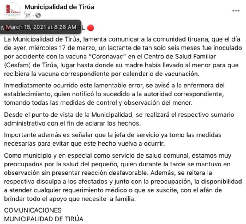 Cabe consignar que lamentablemente esto ya ocurrió en Villarrica, Región de La Araucanía. "Fue un error de la enfermera que tenía que vacunarla", expresó el propio alcalde subrogante, Munir Saphier.