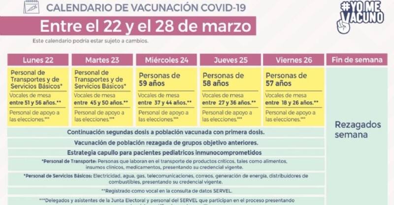 Según el Calendario de Vacunación del Ministerio de Salud, entre el 22 y el 28 de marzo, les corresponderá inyectarse la primera dosis al personal de transporte y servicios básicos, vocales de mesa y personal de apoyo del Servicio Electoral (Servel) para las Elecciones 2021.