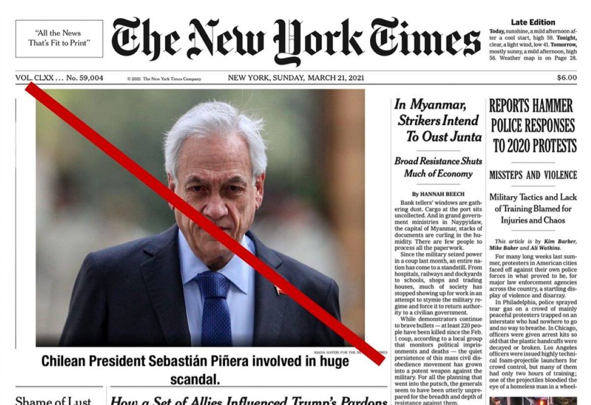 El periódico neoyorkino publicó en su cuenta de Twitter la imagen de la portada que se difundió en la web, señalando que "circula en línea una primera plana manipulada que incluye una imagen y una leyenda sobre Sebastián Piñera. Es un intento de desinformar: The New York Times no ha publicado dicho reporte".