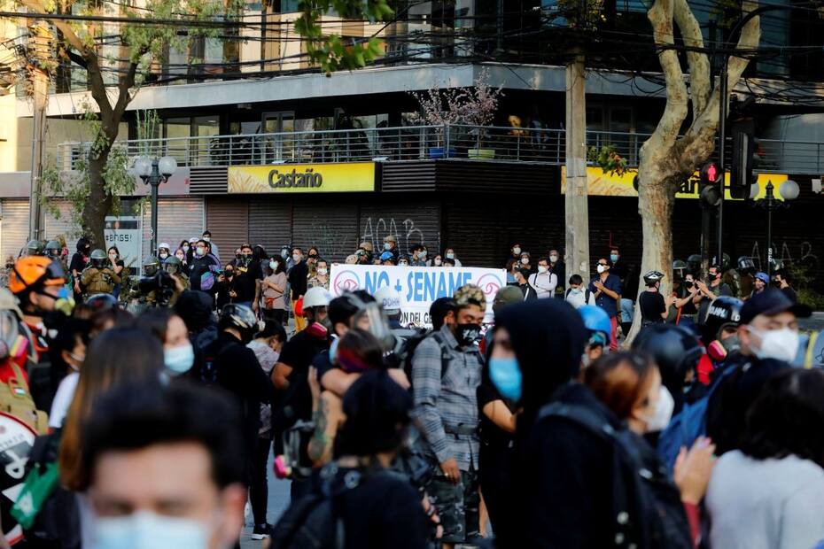 "Aquí estamos rodeadas de Carabineros, mientras la policía debería estar cuidando una estatua", señaló la presidenta de la ONG Red Infancia Chile, Lorena Bustamante, una de las organizaciones que se manifiestan en el lugar.