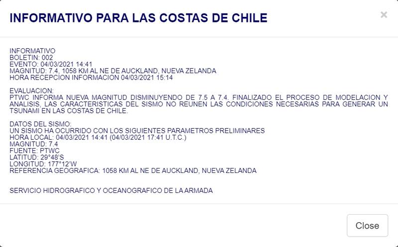 Sin embargo, minutos más tarde se disminuyó la medida del sismo a 7,4, además de descartarse las condiciones para la eventual afectación al territorio nacional.