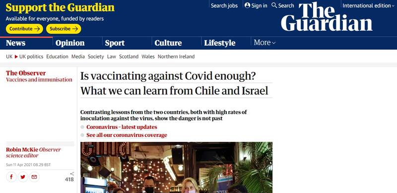 La publicación fue titulada como "¿Es suficiente vacunar contra el Covid? Lo que podemos aprender de Chile e Israel" en la que indican que la enseñanza que se puede obtener de estos dos países con alta tasa de inoculación y que "muestran que el peligro no ha pasado".
