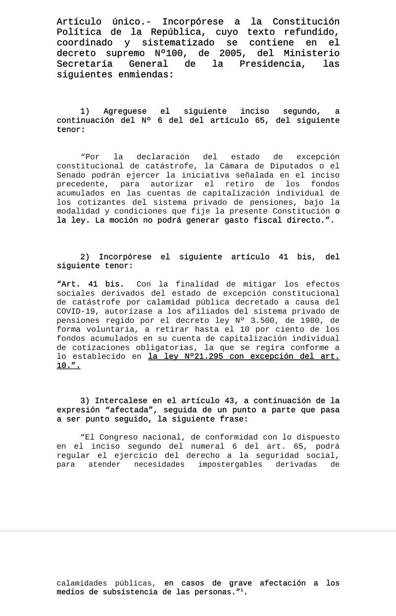 Lo anterior, tiene relación con una reforma a la carta magna que entregue la facultad al Congreso para disponer el retiro de los fondos durante la emergencia sanitaria por Covid-19, lo cual hasta ahora sólo corresponde al ejecutivo, cuya moción no deberá provocar la generación de un gasto fiscal directo.