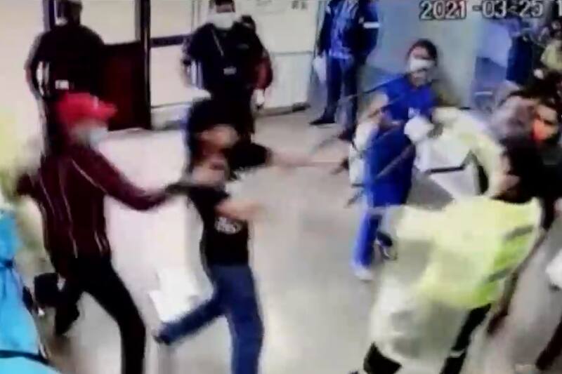 Ante el violento ataque, los especialistas de la salud tuvieron que defenderse con lo que tenían a mano. Si hasta un médico aparece con un piso intentando controlar a los agresores.