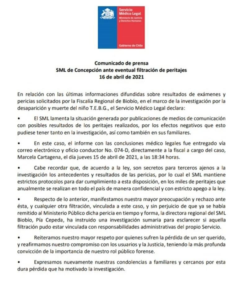 Sobre esta filtración en los medios, el Servicio Médico Legal de Concepción descartó cualquier tipo de implicancia en el tema. "El SML mantiene estrictos protocolos para dar cumplimiento a esta disposición, en los miles de peritajes que anualmente se realizan en todo el país de manera confidencial y con el rigor de la ley", detallaron a través de un comunicado publicado durante esta jornada.