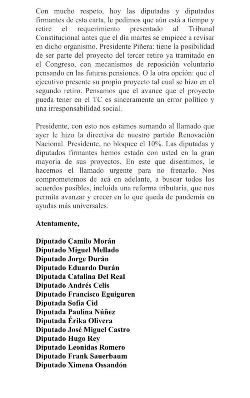 Durante la tarde de este viernes, un grupo de 15 diputados de Renovación Nacional enviaron una carta al Presidente Sebastián Piñera para solicitarle que retire el requerimiento del Tribunal Constitucional presentado para frenar el tercer retiro del 10% de las AFP.