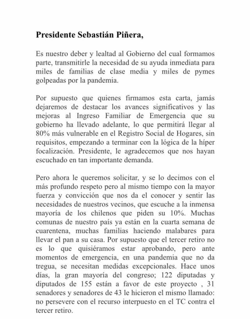 La misiva plantea que Piñera "aún está a tiempo" y que si se retracta "tiene la posibilidad de ser parte del proyecto del tercer retiro ya tramitado en el Congreso, con mecanismos de reposición voluntario pensando en las futuras pensiones".