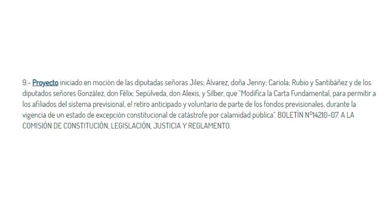 La iniciativa ingresada a la Comisión de Constitución de la Cámara de Diputados expresa que se busca modificar la Constitución para "permitir a los afiliados del sistema previsional, el retiro anticipado y voluntario de parte de los fondos previsionales, durante la vigencia de un estado de excepción constitucional de catástrofe por calamidad pública".