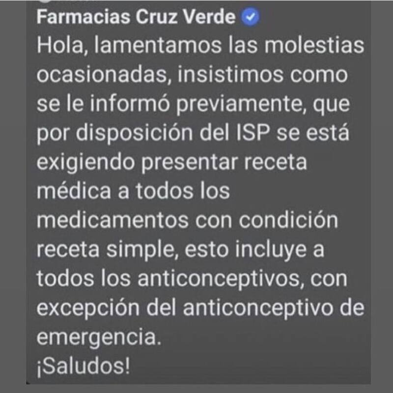"Estamos realizando gestiones para que el ISP revierta en el más breve plazo la disposición de exigir receta médica para la compra de anticonceptivos. Esta medida vulnera aún más a miles de mujeres que ya enfrentan situaciones complejas por esta pandemia", escribió Zalaquett.