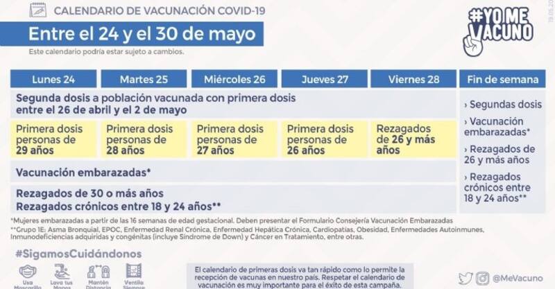 En la práctica, la semana entre el 24 y el 30 de mayo podrán acudir a los centros de inoculación las personas de entre 26 y 29 años que requieran de la primera dosis. Así mismo, podrán hacerlo rezagados mayores de 30, crónicos entre 18 y 24 años, y mujeres embarazadas con más de 16 semanas de gestación.