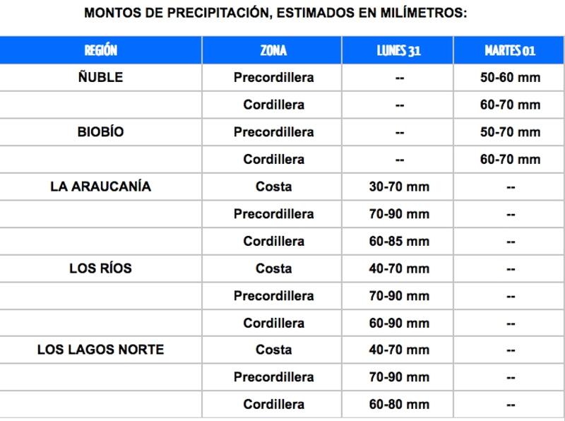 Además informaron que la alerta es para tomar las precauciones del caso ya que habrá una isoterma alta junto con las lluvias en la Araucanía, Los Lagos, Nuble y Biobío, lo que podría generar complicaciones en zonas donde no se acostumbra a la caída de chubascos.