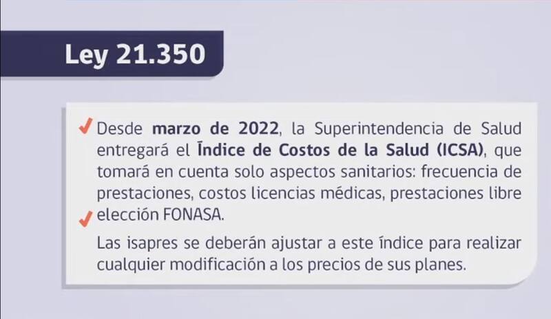 Adicionalmente, conforme a la ley, las Isapres ya no podrán ajustar unilateralmente los planes, pues ahora será la Superintendencia de Salud quien lo regulará mediante un indicador (Índice de Costos de la Salud).