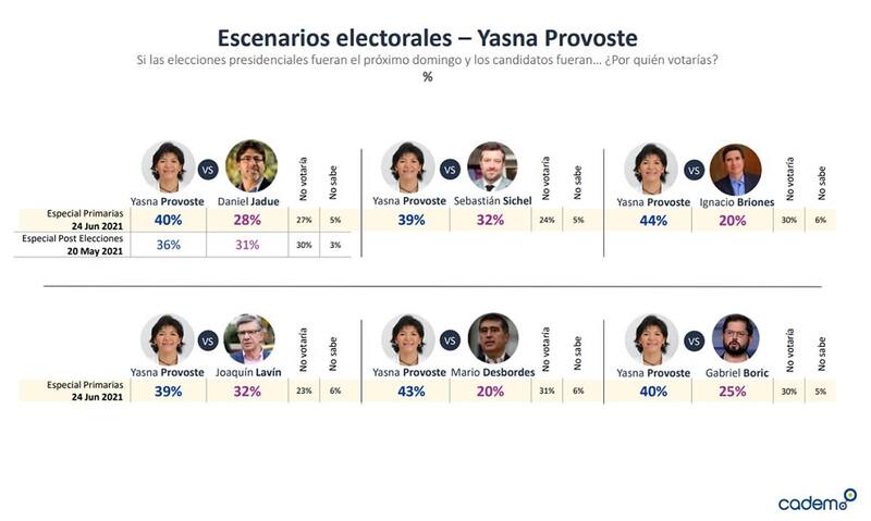 Durante las últimas horas, apareció la más reciente actualización de la encuesta de Plaza Pública Cadem y su especial Electoral, en donde aparece la opción de Yasna Provoste (DC) como la ganadora en todos los posibles escenarios en una eventual segunda vuelta.