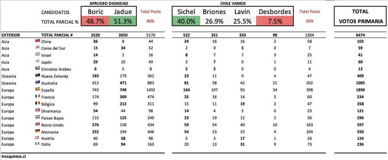 14:24.- En España participó el 25,6% del padrón, y por el lado de Apruebo Dignidad ganó Daniel Jadue con 839 sufragios, por sobre los 690 de Boric. Por Chile Vamos, la preferencia se quedó con Sebastián Sichel quien ganó con 149 votos, superando a Briones (96), Joaquín Lavín (91) y Mario Desbordes (19).