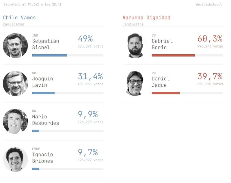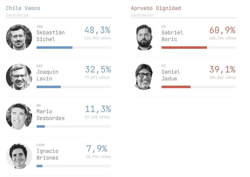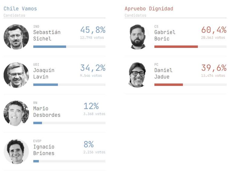 19:32 Con el 46,07% de las mesas escrutadas, que corresponden a 7.639 de 16.582. En Apruebo Dignidad: Gabriel Boric con 60,33% y Daniel Jadue con 39,67%. En Chile Vamos, Sebastián Sichel con 48,64%, Joaquín Lavín con 32,06%, Mario Desbordes con 10,65% e Ignacio Briones con 8,64%.