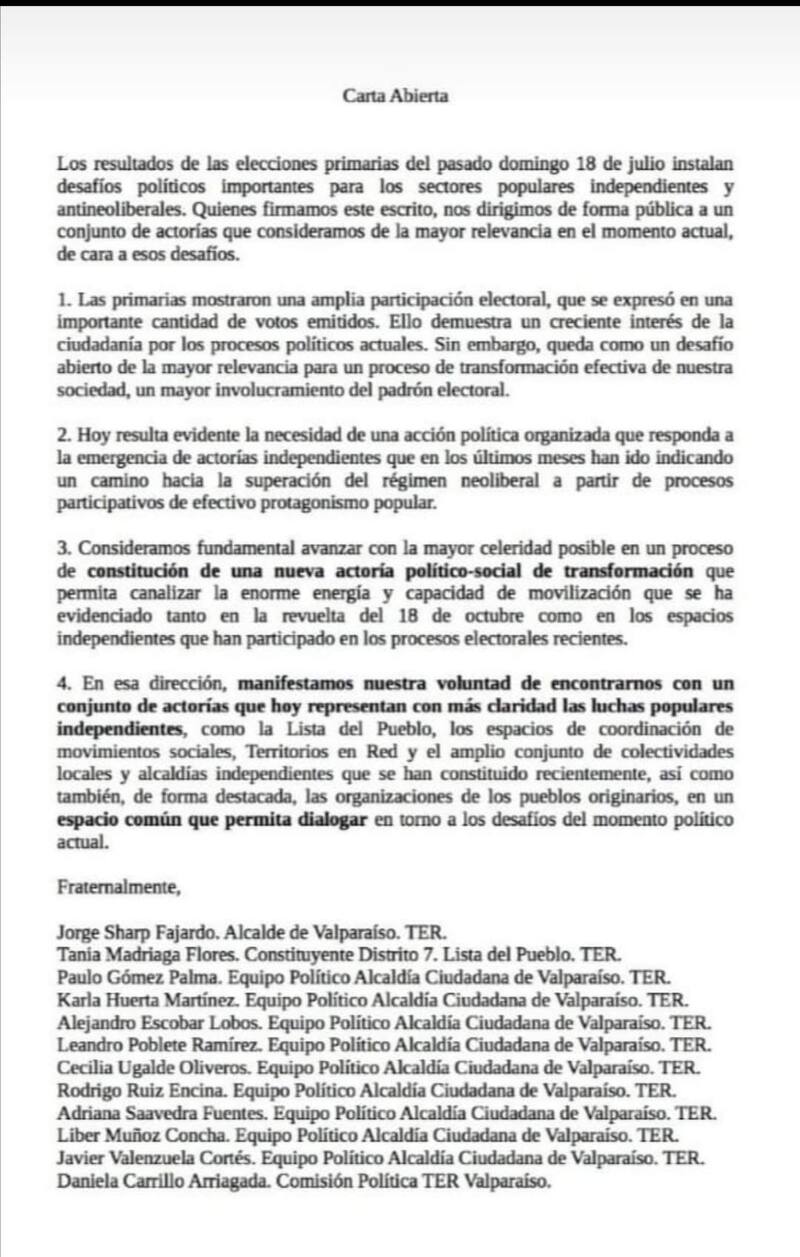 "En esa dirección, manifestamos nuestra voluntad de encontrarnos con un conjunto de actorías que hoy representan con más claridad las luchas populares independientes, como la Lista del Pueblo, los espacios de coordinación de movimientos sociales, Territorios en Red y el amplio conjunto de colectividades locales y alcaldías independientes que se han constituido recientemente, así como también, de forma destacada, las organizaciones de los pueblos originarios, en un espacio común que permita dialogar en torno a los desafíos del momento político actual", cierran los firmantes, que incluyen una decena de funcionarios del Equipo Político Alcaldía Ciudadana de Valparaíso y de Territorios en Red (TER), plataforma político ciudadana de Sharp.