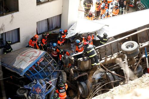 El incidente se produjo cuando uno de los vehículos mayores perdió el control y cayó por espacio de 40 metros por una ladera, hasta impactar a la altura de los primeros pisos de un edificio de departamentos. Luego, le siguieron los otros dos móviles.