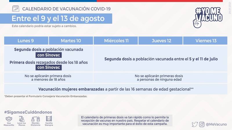 Por ejemplo, a partir del lunes 2 hasta el martes 3 de agosto, se vacunarán las personas que deban recibir su segunda dosis de Sinovac y las primeras dosis de rezagados desde los 18 años con la misma vacuna. Cabe decir que en estas jornadas no se aplicarán dosis a menores de edad.