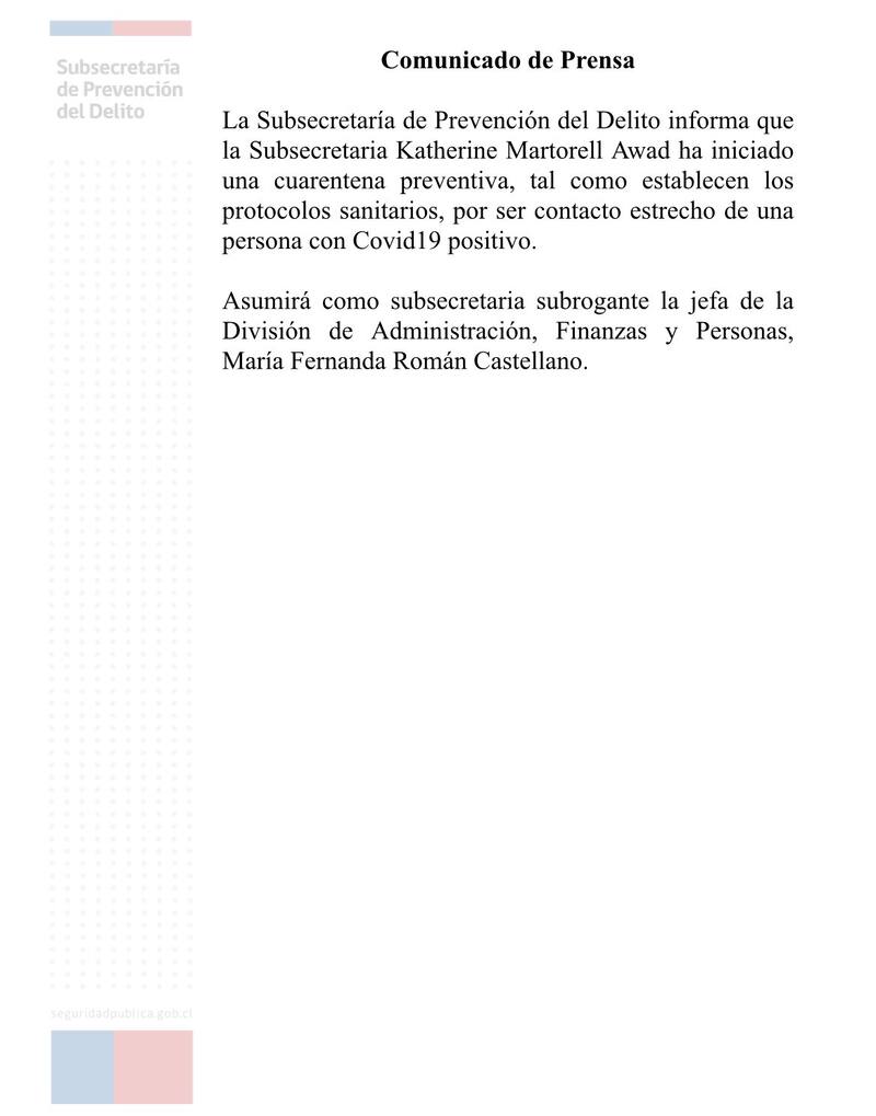 Esta noche, la Subsecretaría de Prevención del Delito dio a conocer que Katherine Martorell inició cuarentena preventiva. Esto debido a que se confirmó que fue contacto estrecho de una persona con Covid-19 positivo.