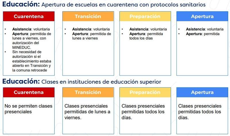 En tanto, para la educación superior, no se permiten las clases presenciales en Cuarentena, pero sí en Transición de lunes a viernes, mientras que todos los días en Preparación y Apertura.