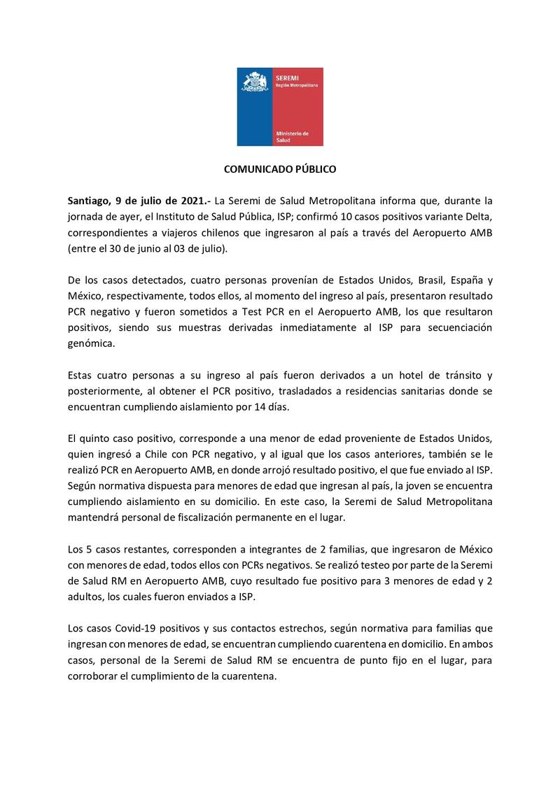 Este viernes 9 de julio se confirmaron diez nuevos casos de la variante Delta en Chile. Hecho que fue informado por el Instituto de Salud Pública activando de inmediato los protocolos necesarios.