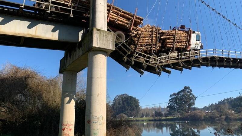 Impactantes imágenes fueron las que se registraron durante este martes, luego de que un camión forestal quedara atrapado en la pasarela Quillem, ubicada en la comuna de Carahue, Región de La Araucanía, debido a su peso por la carga que transportaba.