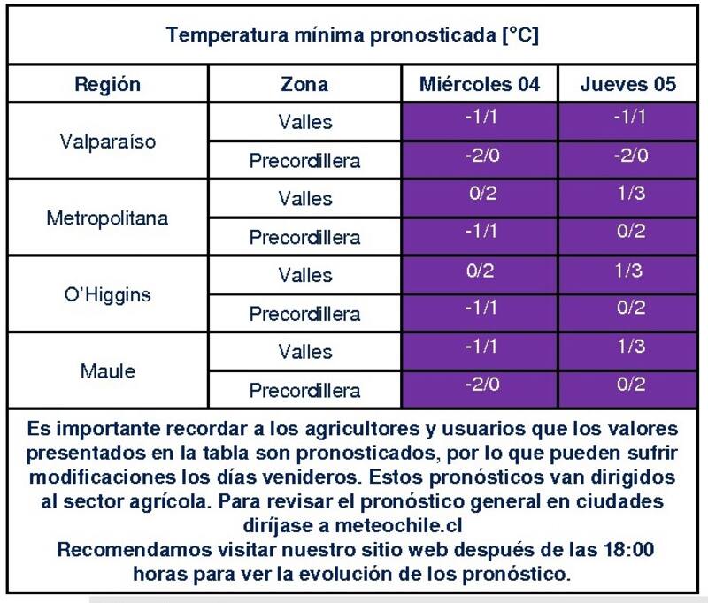 Por la mañana, las mínimas llegarán bordearán los cero grados. Inclusive en la zona precordillerana en la séptima región los termómetros marcarán los -2°. Lo que se repetirá el jueves 5 de agosto pero en la precordillera de Valparaíso.