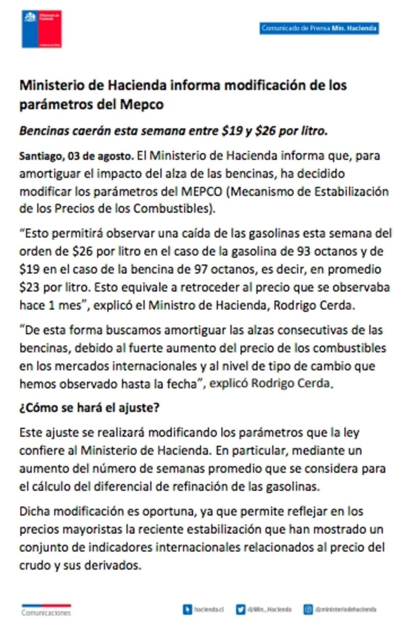 "Esto permitirá observar una caída de las gasolinas esta semana del orden de $26 por litro en el caso de la gasolina de 93 octanos y de $19 en el caso de la bencina de 97 octanos, es decir, en promedio $23 por litro. Esto equivale a retroceder al precio que se observaba hace 1 mes", detalló el Ministro de Hacienda, Rodrigo Cerda.