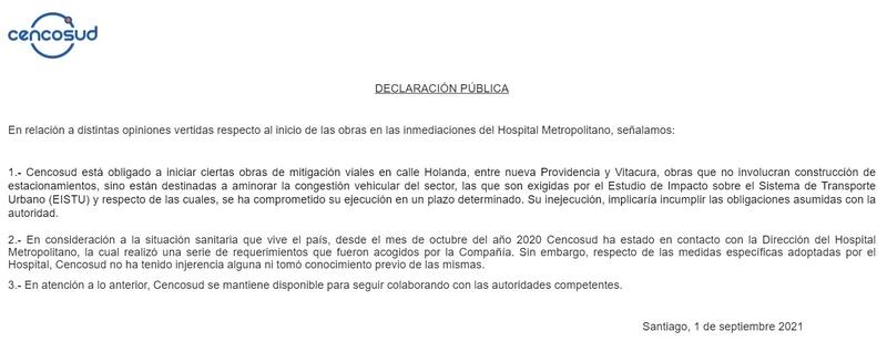 "En consideración a la situación sanitaria que vive el país, desde el mes de octubre del año 2020 Cencosud ha estado en contacto con la Dirección del Hospital Metropolitano, la cual realizó una serie de requerimientos que fueron acogidos por la Compañía. Sin embargo, respecto de las medidas específicas adoptadas por el Hospital, Cencosud no ha tenido injerencia alguna ni tomó conocimiento previo de las mismas", añadieron.