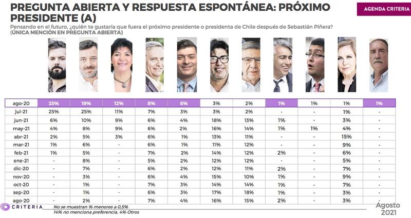 Más atrás aparecieron Yasna Provoste (Democracia Cristiana, 12%), José Antonio Kast (Partido Republicano, 8%), Franco Parisi (Partido de La Gente, 6%) y Marco Enríquez-Ominami (Partido Progresista) y Eduardo Artés (Unión Patriótica), con un 1% cada uno.