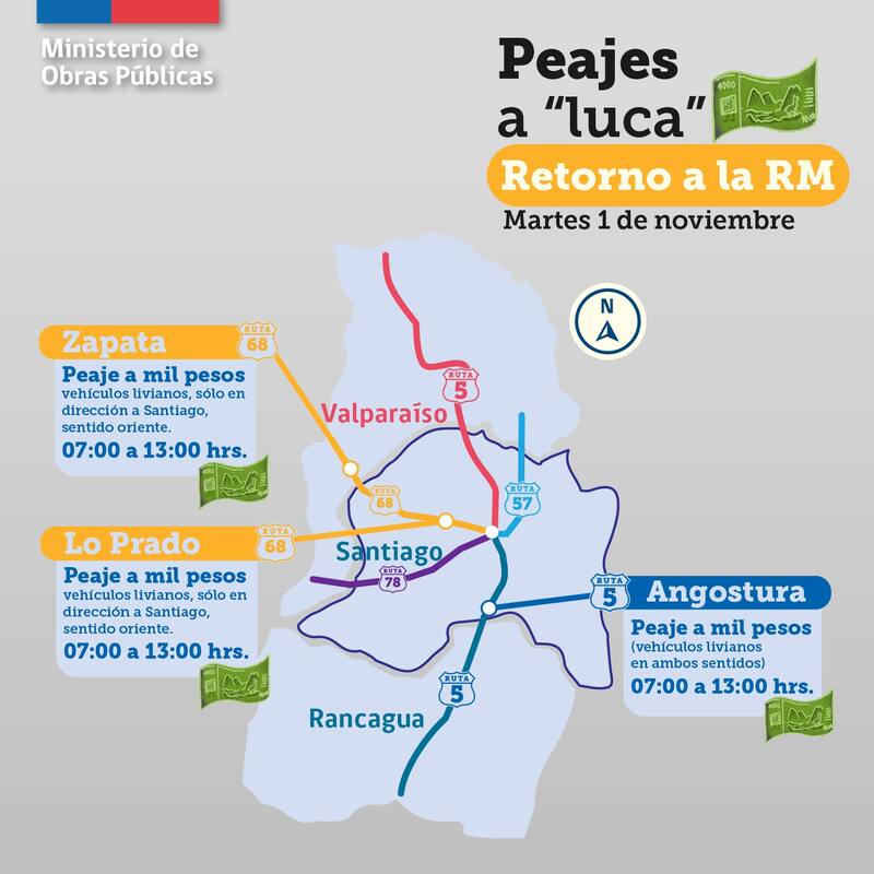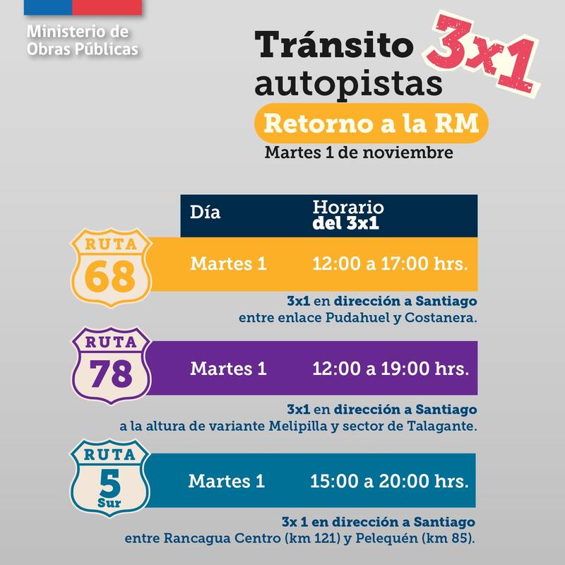 Las autoridades recomendaron planificar con tiempo el retorno a la Región Metropolitana y aprovechar los incentivos para viajar en ciertos tramos horarios. Revisa en esta nota a qué hora y en qué rutas hay peaje a luca y sistema 3x1 este feriado del martes 1 de noviembre.