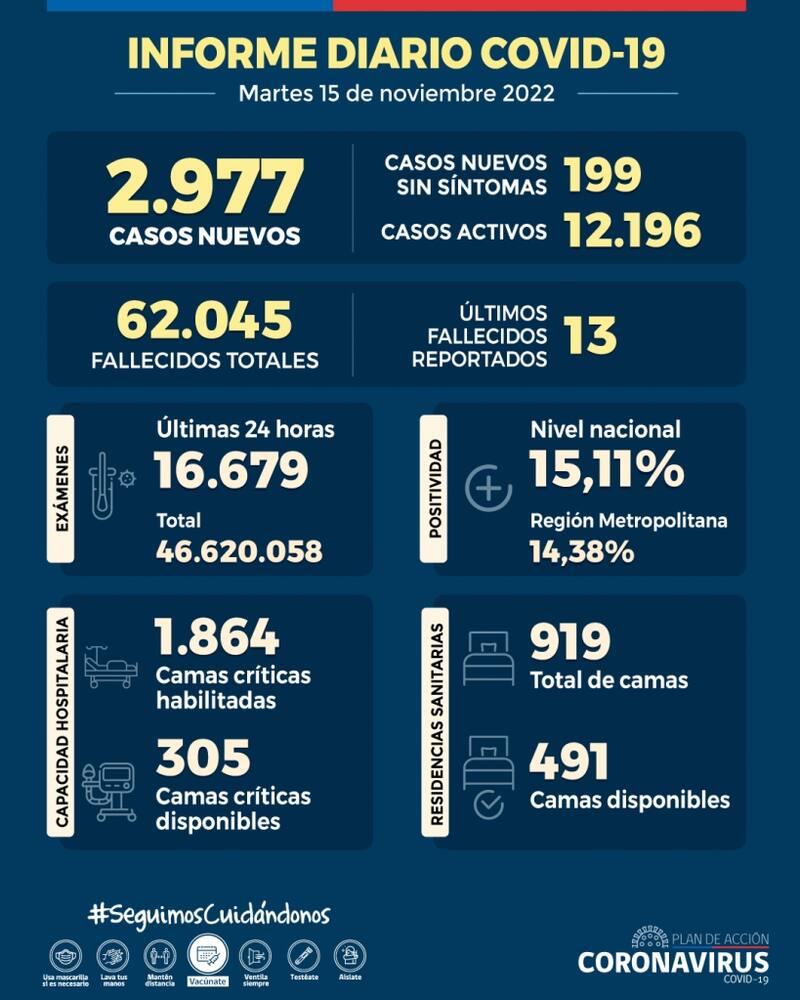 Este martes 15 de noviembre, el Ministerio de Salud compartió un nuevo balance respecto a la pandemia del Covid-19, registrando 2.977 casos nuevos de la enfermedad, de los cuales 1.943 corresponden a personas sintomáticas y 199 no presentan síntomas. Además, se registraron 835 test PCR Positivo que no fueron notificados.