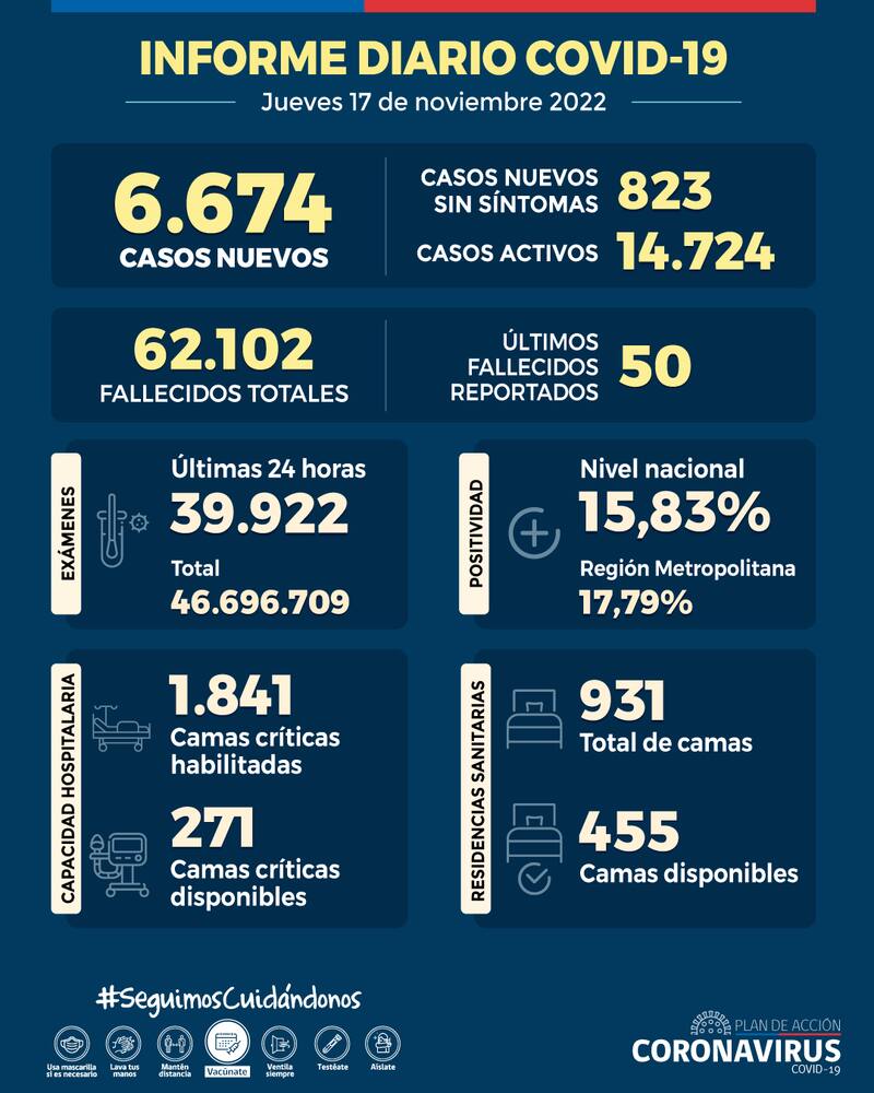 El Ministerio de Salud (Minsal) informó este jueves 17 de noviembre que se registraron 6.674 casos nuevos de Covid-19 en Chile, 3.331 corresponden a personas sintomáticas y 823 no presentan síntomas. Además, se registraron 2.520 test PCR positivo que no fueron notificados.