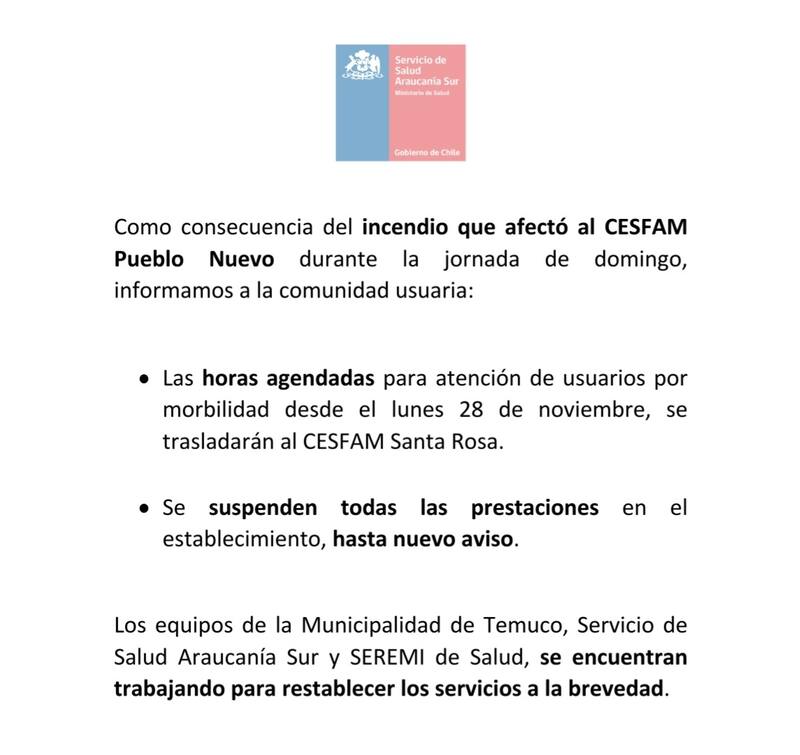 Cabe destacar que a través de redes sociales, el Servicio de Salud Araucanía Sur informó que las horas agendadas por los usuarios para este lunes serán atendidas en el Cesfam Santa Rosa de la misma región.