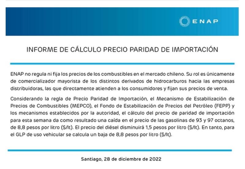 Durante la tarde de este miércoles la Empresa Nacional del Petróleo (Enap) informó que todos los combustibles descenderán de precio a partir de este jueves 29 de diciembre.