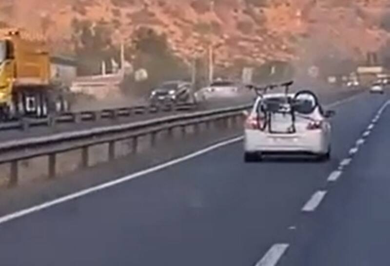 El hecho sucedió durante la tarde de este martes y lo más sorprendente del video son los momentos en los que el auto comienza a zigzaguear esquivando los camiones que venían de frente.